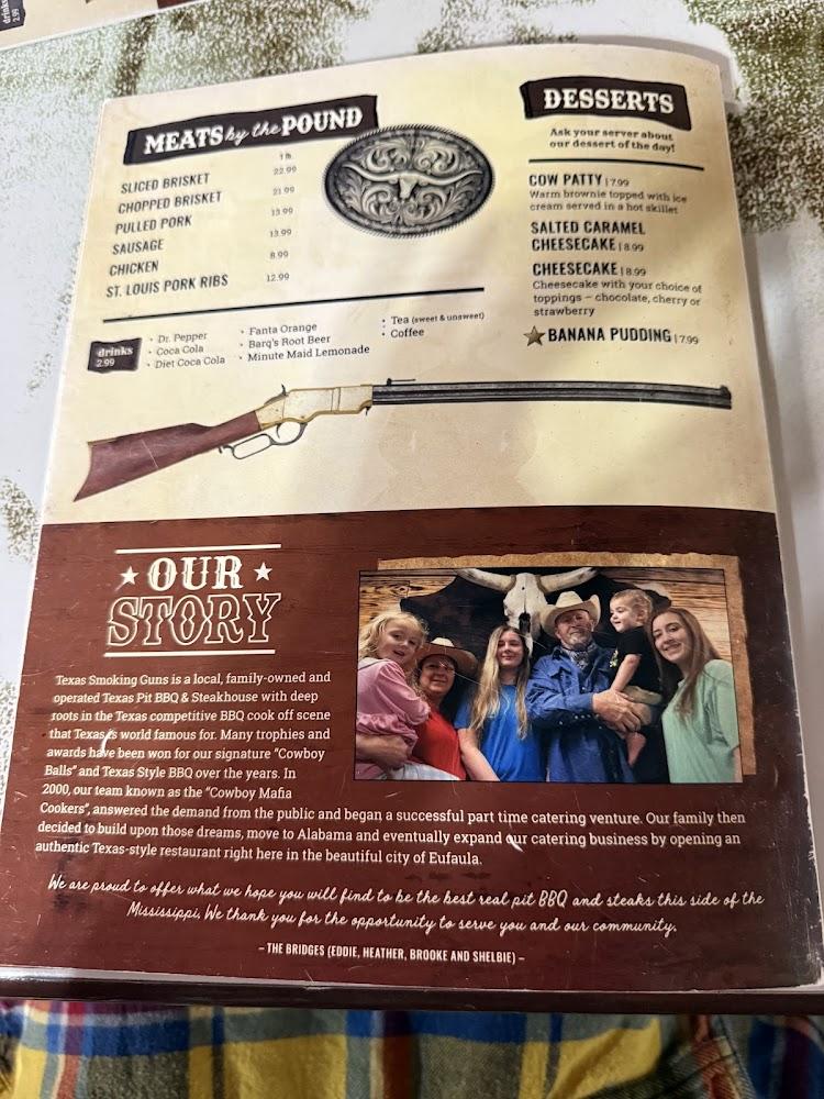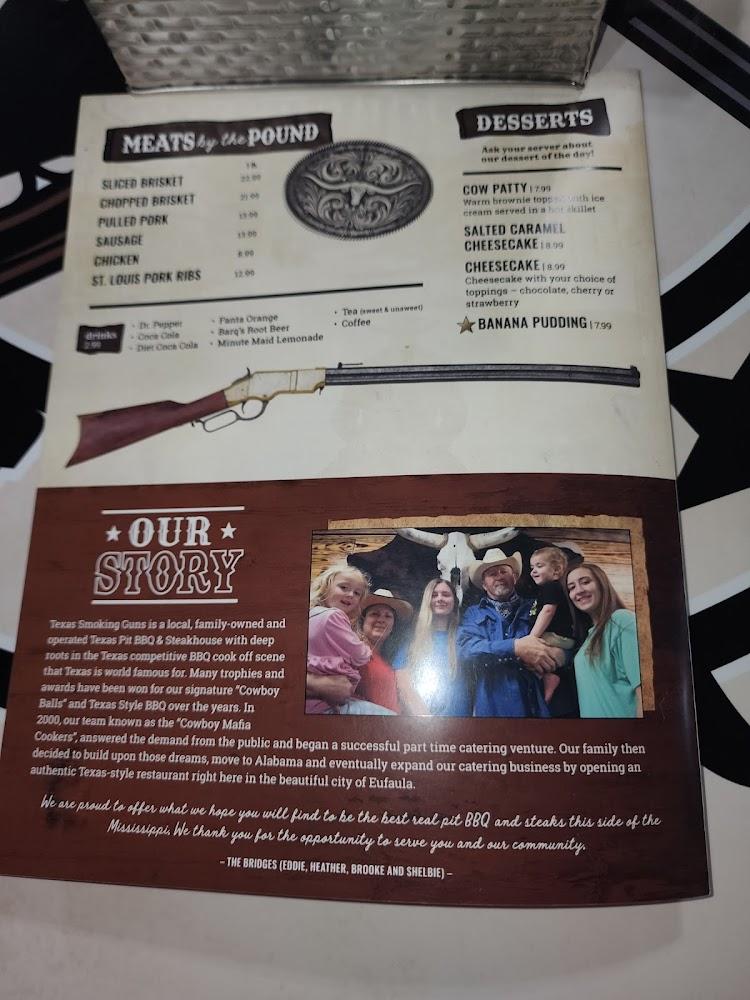 Texas Smoking Guns features a diverse menu, focusing on Texas-style barbecue and steakhouse classics. The meat options include slow-smoked brisket, ribs, pulled pork, and specialty sausages. Dishes are prepared using methods steeped in tradition. Guests can select from a variety of sides, including fresh salads from the salad bar, and popular choices like baked beans or Brussels sprouts.